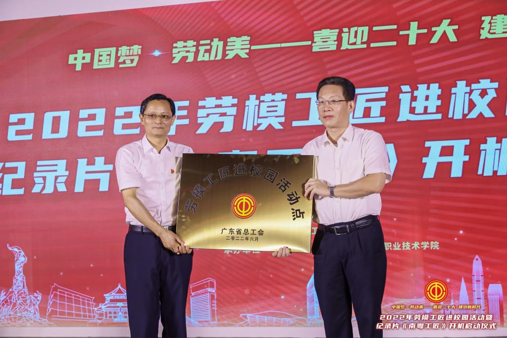 6月23日上午,“中国梦·劳动美——喜迎二十大 建功新时代”2022年劳模工匠进校园活动暨纪录片《南粤工匠》开机启动仪式在广东轻工职业技术学院举行。启动仪式由全国总工会宣传教育部指导,广东省总工会主办,广东广播电视台、广东轻工职业技术学院承办。