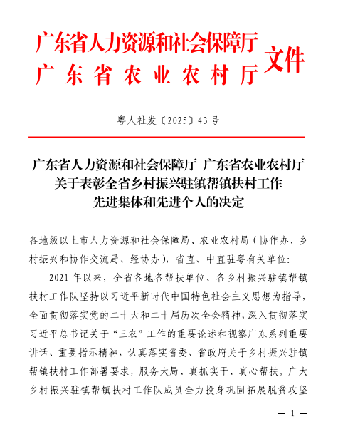12月8日,广东省人力资源和社会保障厅、广东省农业农村厅联合印发《关于表彰全省乡村振兴驻镇帮镇扶村工作先进集体和先进个人的决定》,对在乡村振兴驻镇帮镇扶村工作中表现突出的集体和个人予以表彰。我校易广老师经化州市推荐,由市、省两级多部门考察和审核,被授予“广东省乡村振兴驻镇帮镇扶村工作先进个人”荣誉称号。