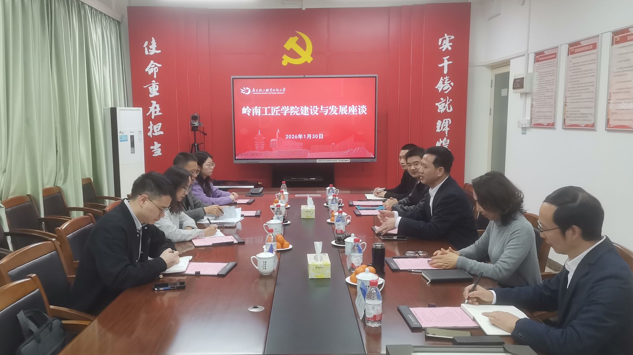 为推进学校岭南工匠学院高质量建设与发展,凝聚多方智慧共商工匠培育与文化传承路径,1 月 30 日上午,学校岭南工匠学院建设与发展座谈会在新港校区办公楼二楼会议室顺利召开。省总工会一级调研员、省教科文卫工会党支部书记谢岩梅,省教科文卫工会副主席胡建钢,省教科文卫工会试用期干部周超、姚楚晖,及学校党委副书记廖志成等领导出席了座谈会。