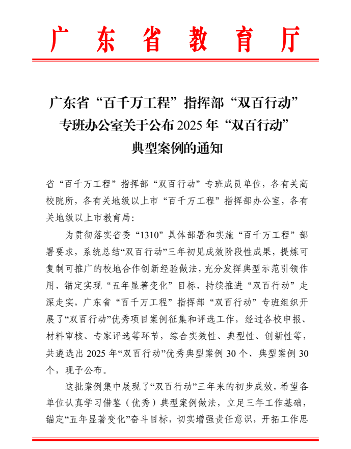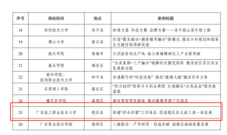 1月16日,广东省“百千万工程”指挥部“双百行动”专班组织开展了“双百行动”优秀项目案例征集和评选工作,我校报送的“构建‘四合四塑’工作体系 促进德庆农文旅工商一体发展”案例入选2025年广东省“双百行动”典型案例(全省30个),该案例聚焦产业科技发展支撑,充分体现我校职业本科师资赋能县域经济高质量发展的成果成效。